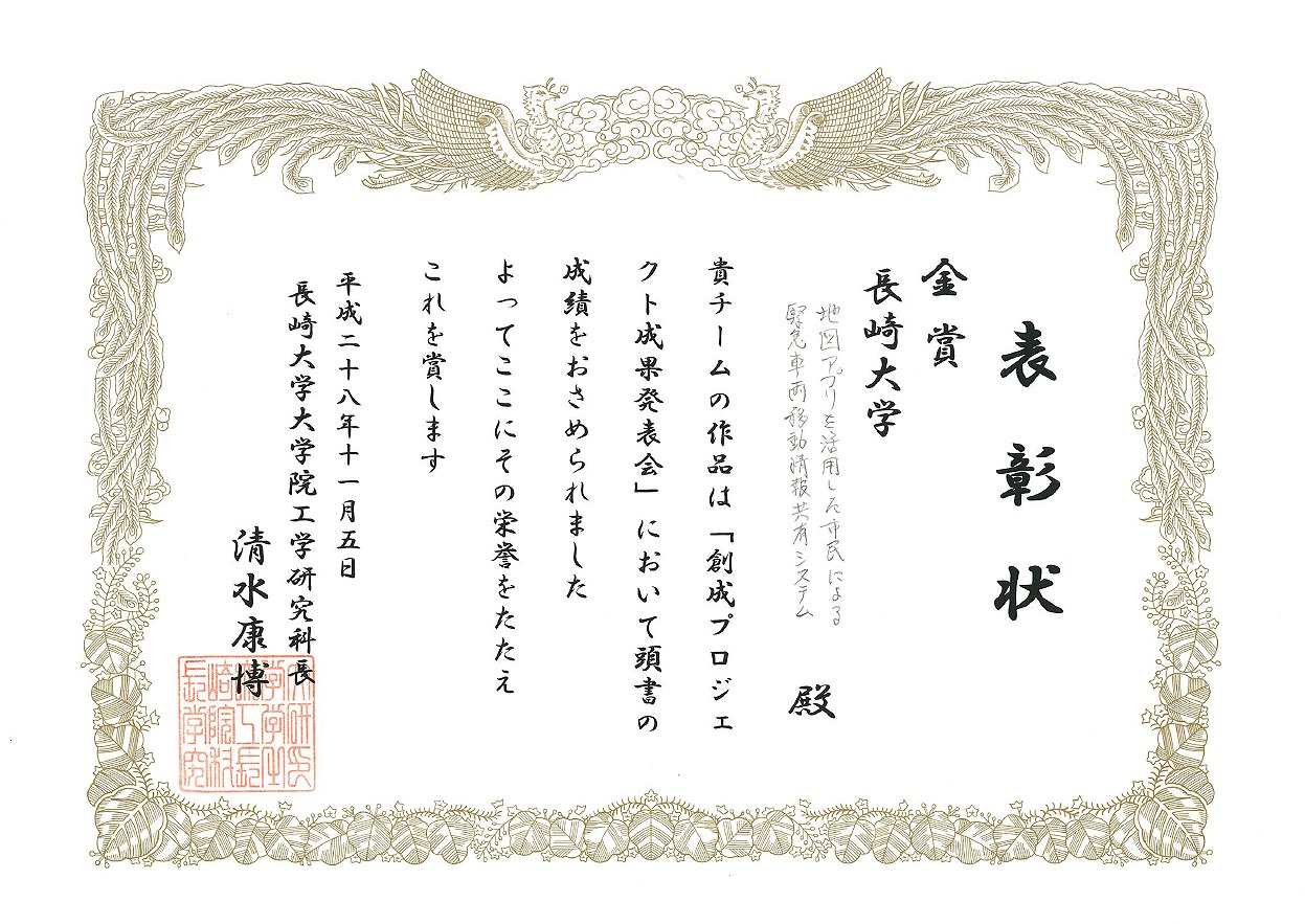 長崎大学工学研究科平成28年度創成プロジェクト最終成果発表会において、情報工学コースの小林透教授がアドバイザーとして担当したチーム 「地図アプリを活用した市民による緊急車両移動情報共有システム」が金賞を受賞しました。本システムは、スマホを使って急患を乗せた 一般車両の位置情報をサーバを経由して付近の車に通知することで、一般車両でもあたかも救急車のように、急患を緊急搬送できるという 画期的なシステムです。